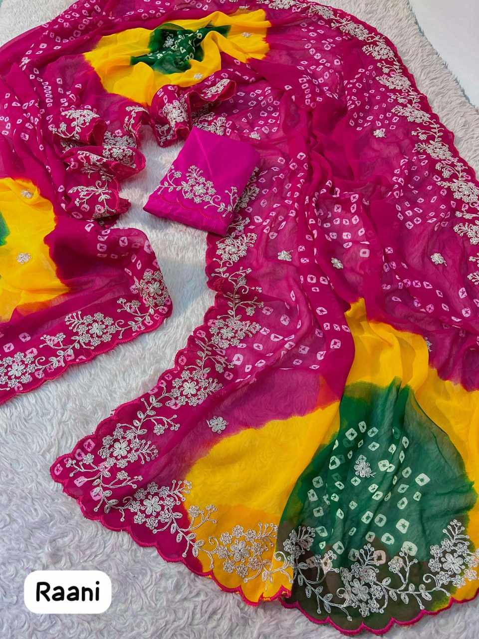 | Name : | PIYU P1038 MULTI COLOR PINK BANDHANI Saree |