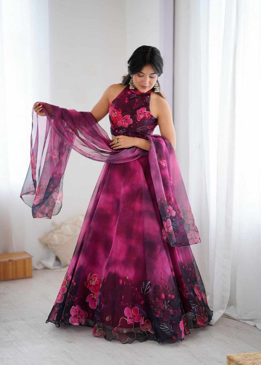 Anarkali Gown – Digital printed Jimmy Organza silk suit with a huge, elegant flair